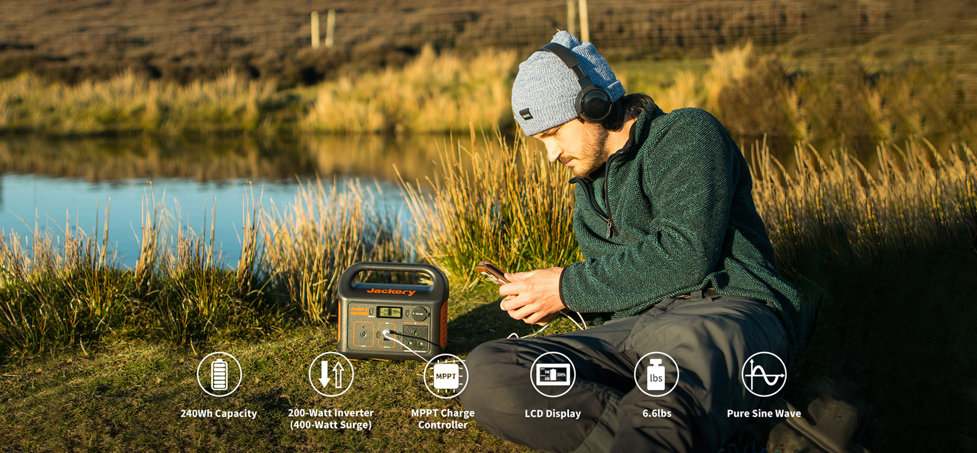 Jackery Explorer 240 Portable Power Station has a 240Wh lithium-ion battery pack. The multifunctional outputs, including 1 * AC outlet, 1 * DC car port, and 2 * USB-A ports, with a pure sine wave inverter, helps you power many types of devices simultaneously.